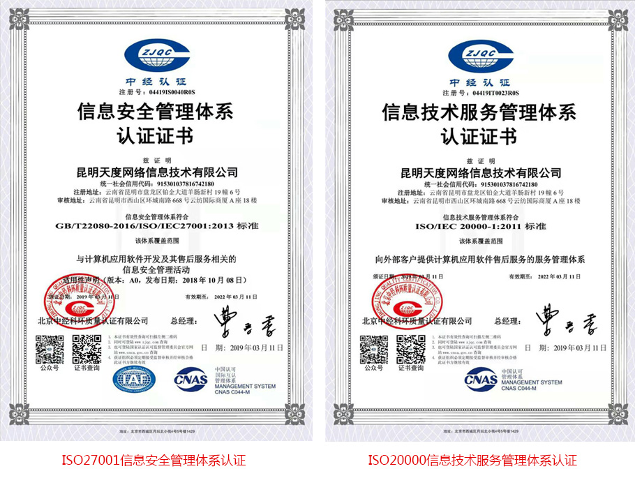 尊龙凯时集团获得ISO27001信息安全管理体系认证、 ISO20000信息技术服务管理体系认证、ISO9001质量管理体系认证等多重体系认证,这标志着在尊龙凯时在信息安全管理、信息技术服务管理、计算机软硬件开发质量管理等方面进入国际标准化体系。